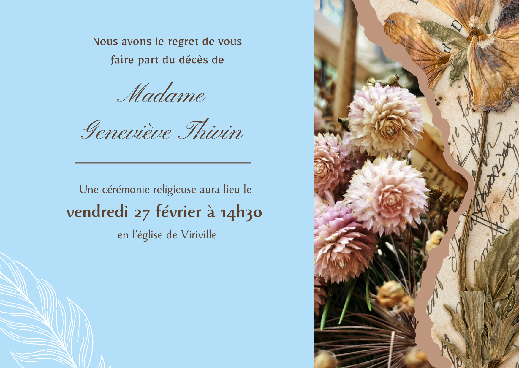 Nous vous invitons à utiliser cet espace pour laisser vos condoléances, partager des photos souvenirs, une anecdote ou exprimer vos pensées à travers des poèmes ou des textes. Cet endroit est un lieu d'expression dédié à honorer la mémoire de Geneviève THIVIN.